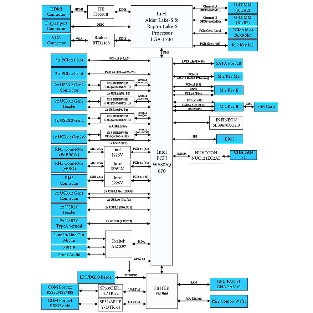 - Intel® 14th/13th/12th Gen (Raptor Lake-S Refresh/Raptor Lake-S/Alder Lake-S) Core™ Processors with W680 chipset