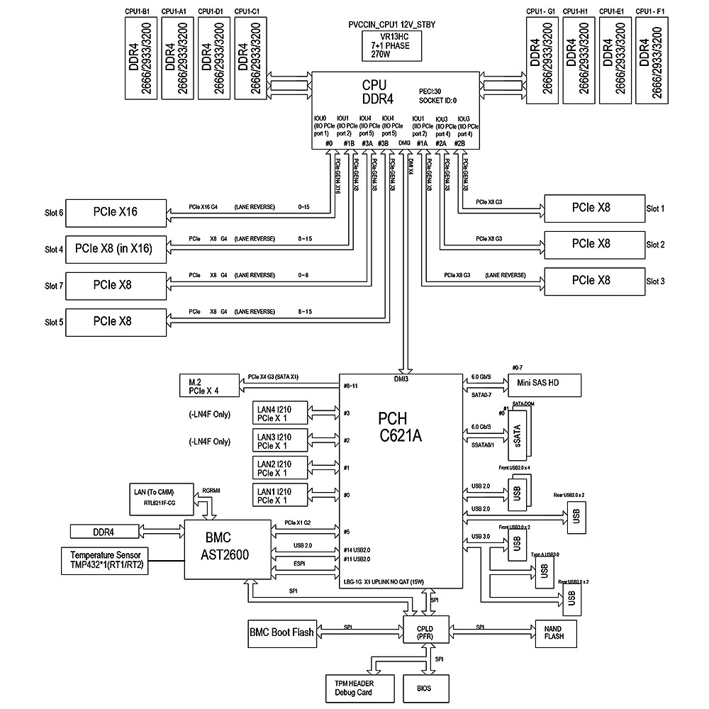 • 3rd Gen Intel® Xeon® Scalable processors, Single Socket LGA-4189 (Socket P+) supported, CPU TDP supports Up to 270W TDP